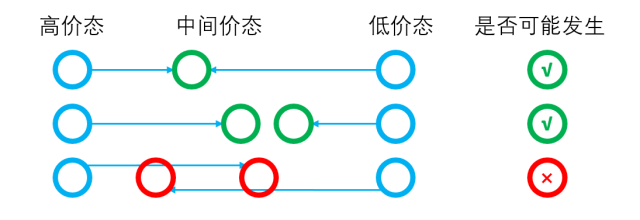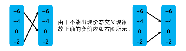 也有部分归中反应会使同种元素的化合价彼此接近但不能达到相同价态,但是不存在价态交叉现象,如下图: