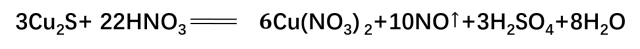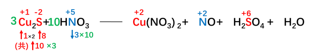 当遇到一种物质中有两种元素变价时,可以进行整体配平。此处我们使用硫化亚铜和硝酸的反应作为例子: