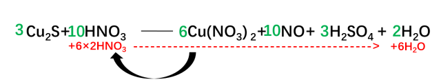 此处注意:由于产物硝酸铜的硝酸根直接来自于硝酸并未变价,故①中已配平的10个硝酸不含硝酸铜中的硝酸根。换言之,硝酸铜中的硝酸根需要额外增加硝酸来提供!于是配平如下: