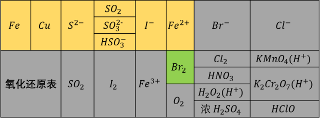 深蓝底色部分表示还原剂,从左到右还原性依次递减;浅蓝底色部分表示氧化剂,从左到右氧化性逐渐递增。表中任一还原剂可被其正下方及正下方右侧所有氧化剂氧化;任一氧化剂可以氧化其正上方及正上方左侧所有还原剂(如下图,溴可以氧化所有黄色底色的还原剂)。